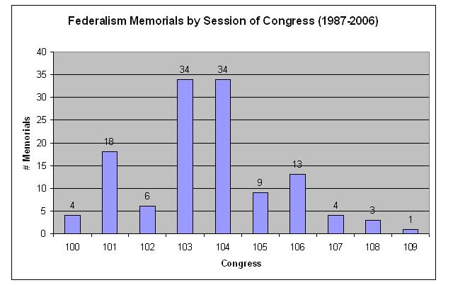 The 112th Congress is not unique in attracting memorials from states on federalism issues. I recently collaborated on a research project with Justin Gollob of Mesa State College that analyzed the content of memorials to Congress from 1987-2006. Most of the memorials addressed an intergovernmental issue. However, we isolated memorials that addressed the general topic of state-federal relations in the American system.